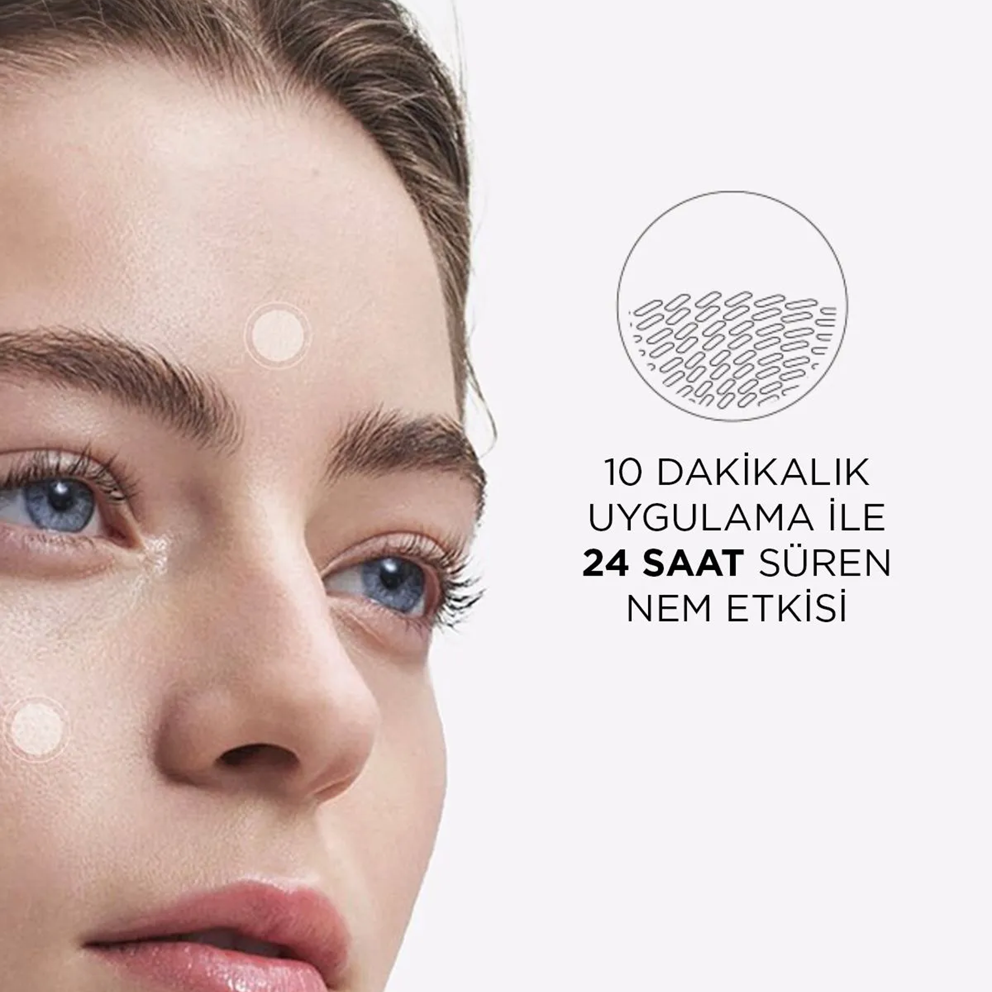 - Hyaluronik Asit ve Fransız Kelebek Lavantası içeriği sayesinde cildin doğal nem bariyerini güçlendirir, seramid seviyesini artırarak nem kaybını önler.