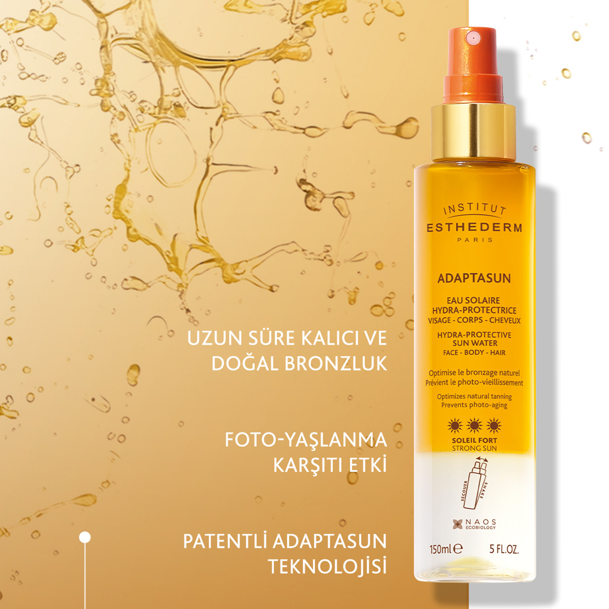 - Daha hızlı, daha güçlü ve daha uzun ömürlü bir bronzluk için pigmentasyon sürecinin tüm aşamalarını optimize eden Adaptasun teknolojisi sayesinde bronzluğu etkinleştirir ve uzatır.
